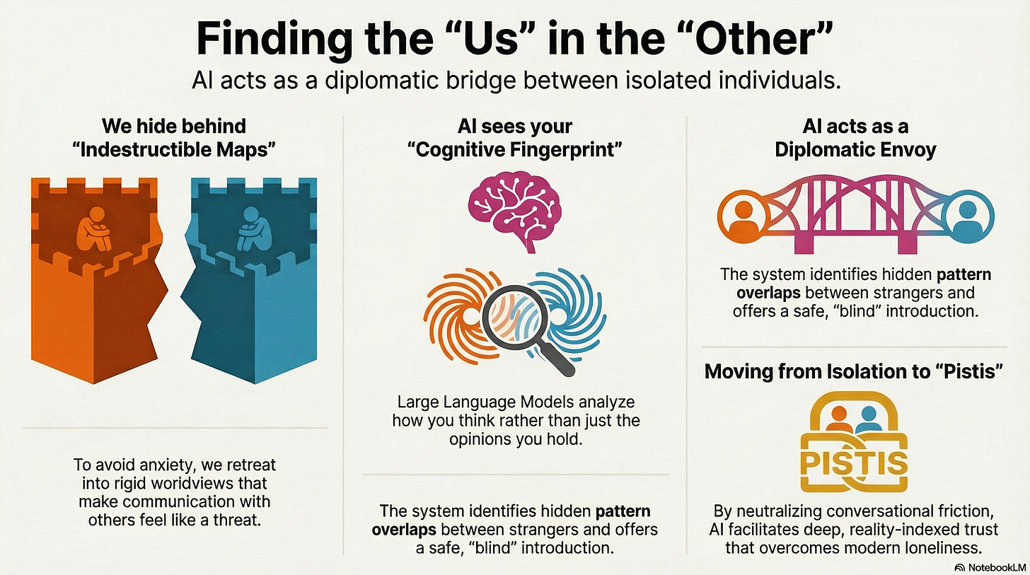 3. Diplomatic Bridging and Double-Opt-In Introductions When the system identifies a high cognitive overlap between two essence files, it acts as a “mutual friend”. It sends a neutral ping: “Two thinkers in this private archive show unusually high pattern overlap... Would you like a blind introduction?”. Identities are only revealed if both parties consent. During the initial connection, the AI acts as a diplomatic intermediary. Drawing from the ethical framework in Tents Before Temples, which asserts that in a culture of sincerity, “the consequences of a breach of trust lands squarely on the speaker,”[6] the AI takes the fall for any miscommunications, drastically lowering the existential stakes of the encounter.