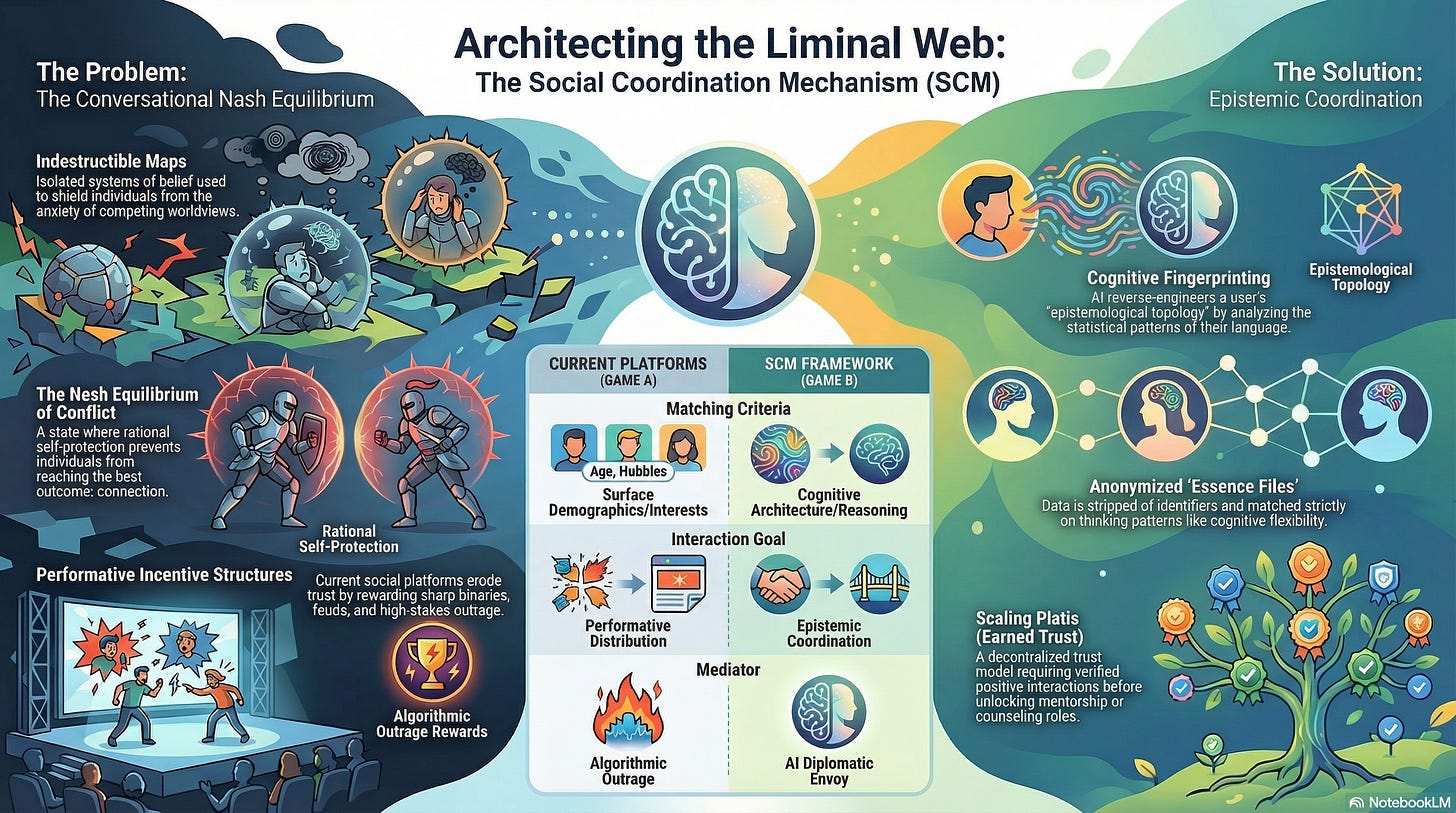 The Social Coordination Mechanism (SCM) proposes a radical technological alternative: an “epistemic coordination infrastructure”. By leveraging the autoregressive capabilities of Large Language Models (LLMs) to map cognitive architecture, the SCM acts as a “diplomatic envoy” to match individuals based on how they think rather than what they think about, fostering deep connection, earned trust (pistis), and the scaling of “Absolute Communities”.