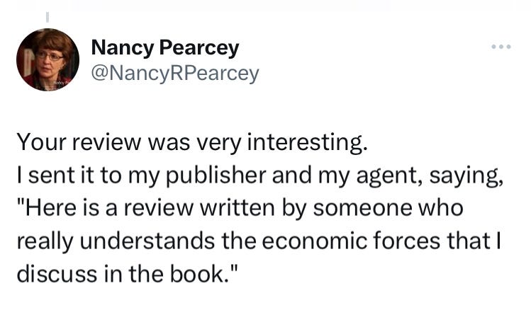 In the meantime, this Substack is the best place to get reliable content. I have been reading quite a few books and will be writing reviews to share. This one about Nancy Pearcey’s new book received a nice endorsement from the author